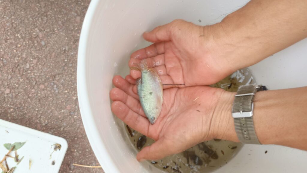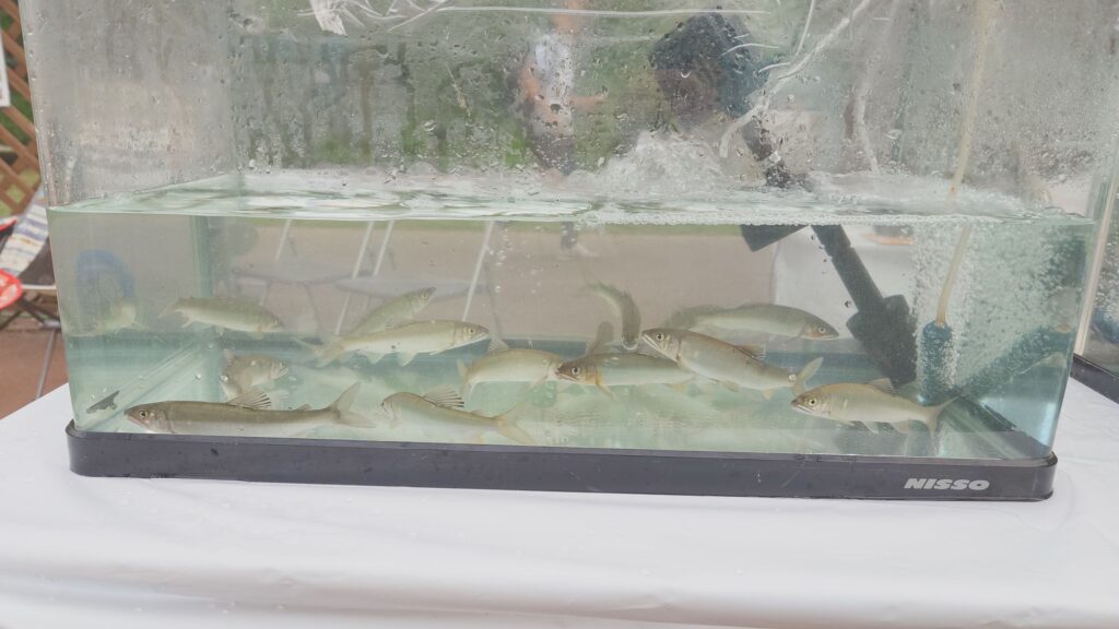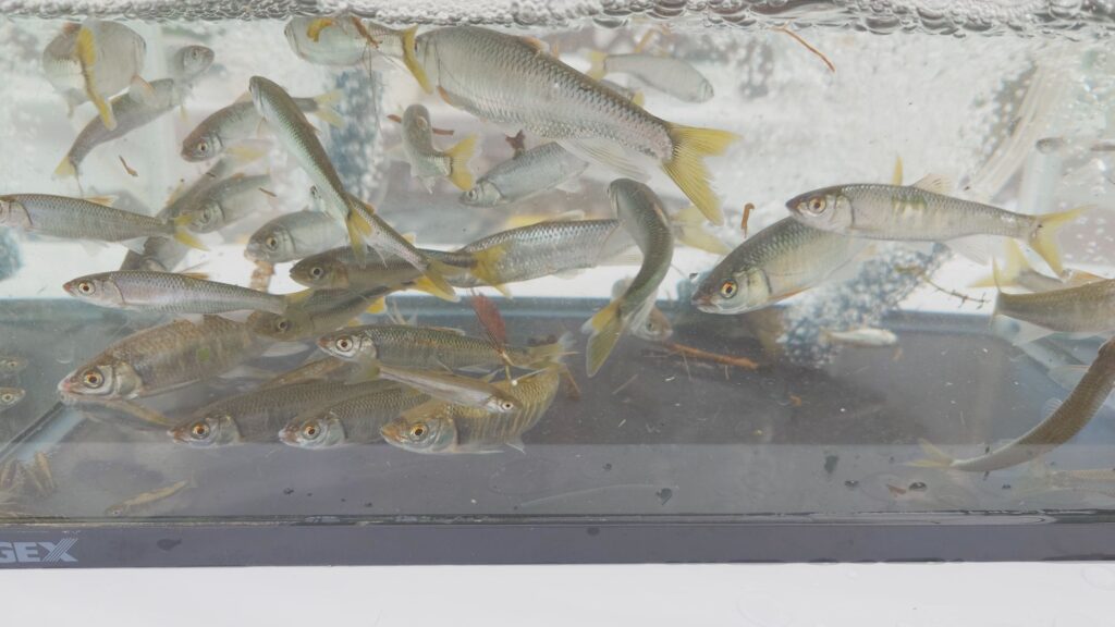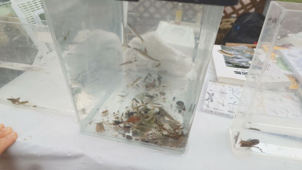今回はいつも通りの魚と共に熱帯魚のグラミーの成魚も取れたので展示をしておりました。