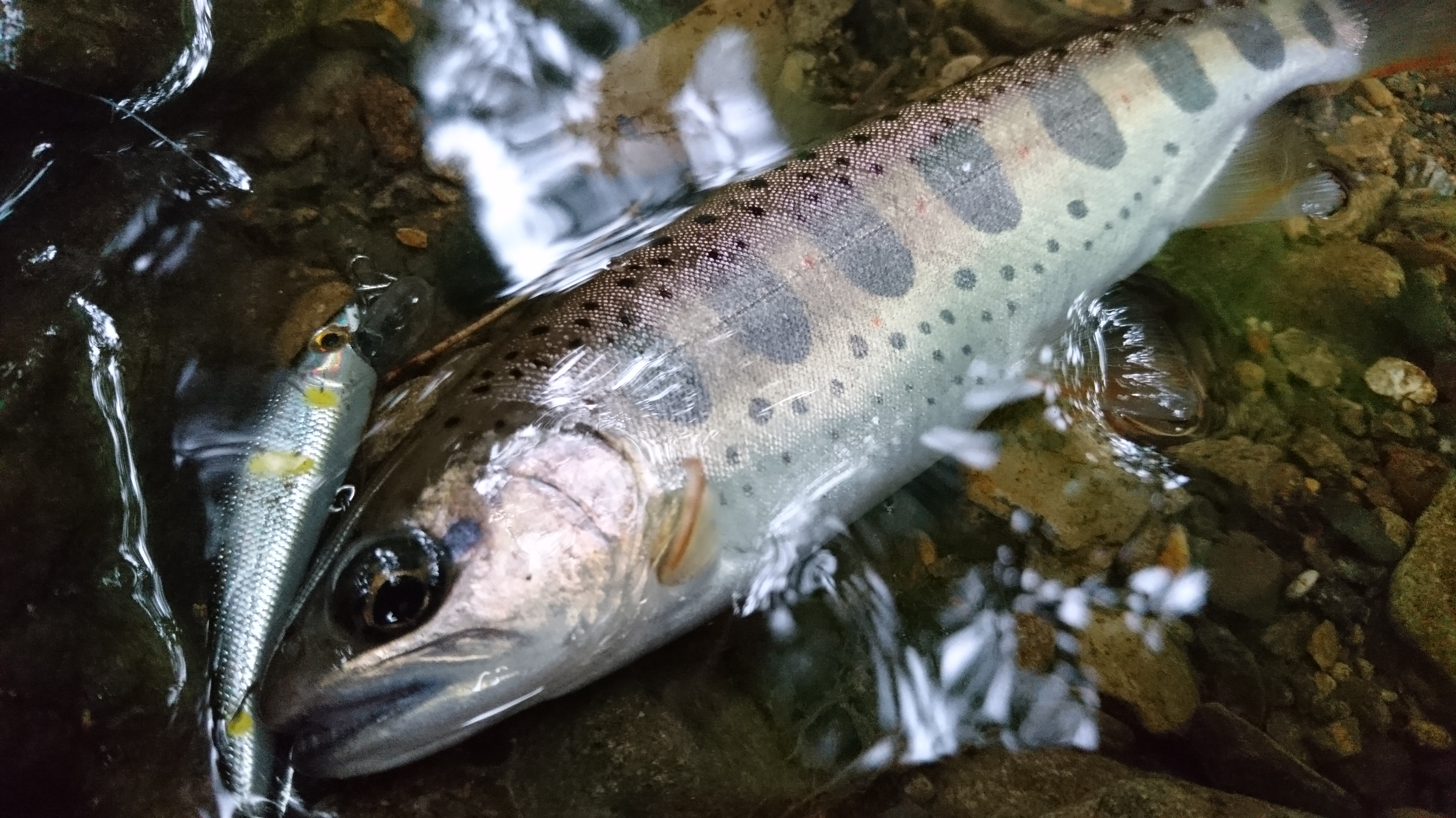 | コメント | 雨の中、昼から祖父谷川に釣行。 川はささ濁りで水量も増して好条件。 釣れたのはアマゴ4匹、イワナ2匹。 最大は22㎝ほどのアマゴで他は15~18㎝のサイズでした。 他には20㎝程のイワナを2匹程バラシました(足元に落ちた) 淵だけでなく、小さな落ち込みや流れの中にも魚がいたので高活性だったと思います。 |