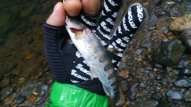 雨の中の釣行!! 気温 22℃ 水温 18℃ 要約、恵みの雨!! 放流区域外での釣果 カワムツ・オイカワ沢山の中でのアマゴ14匹 キープ アマゴ3匹(6~7寸サイズ) 竿 5ft Seaguar R-18Hard4lb. スプーン